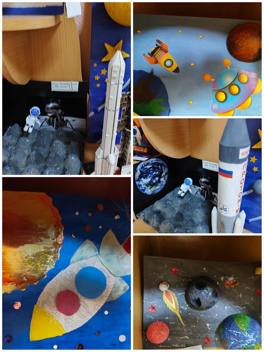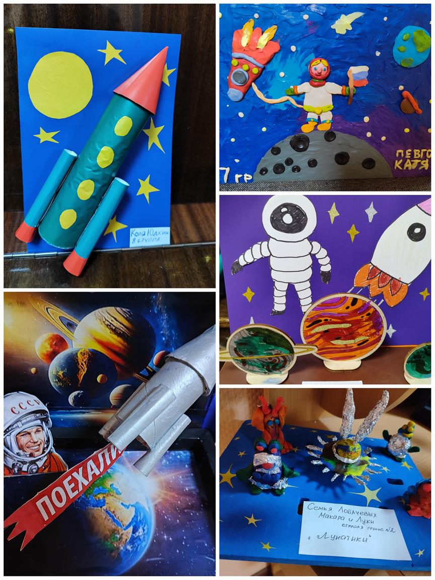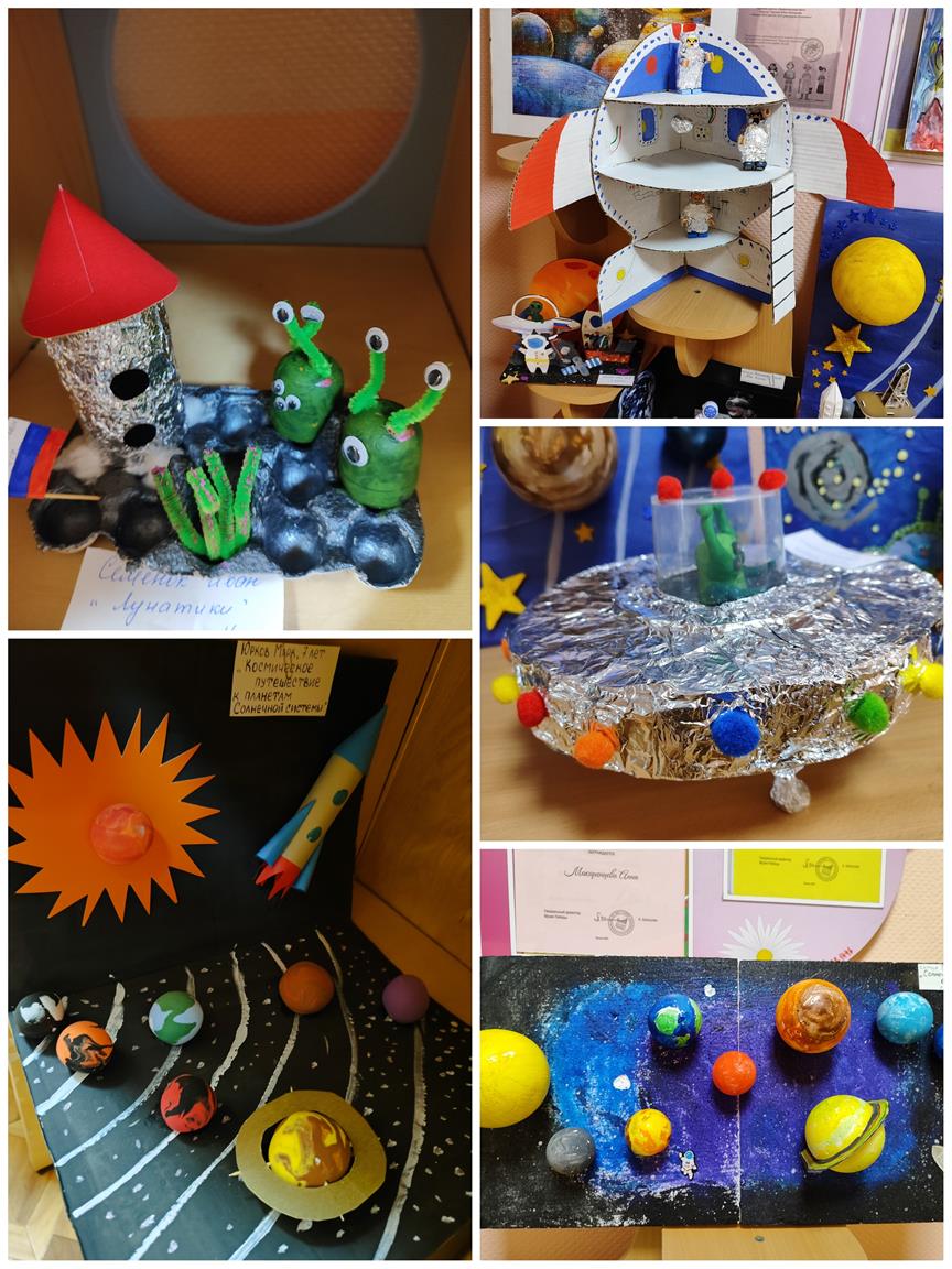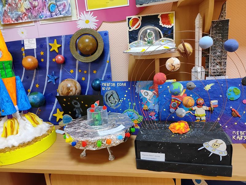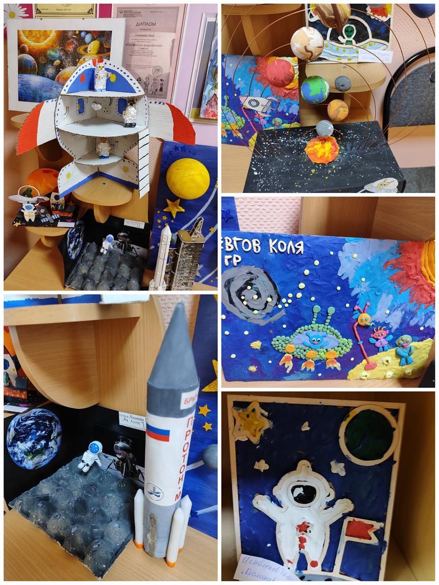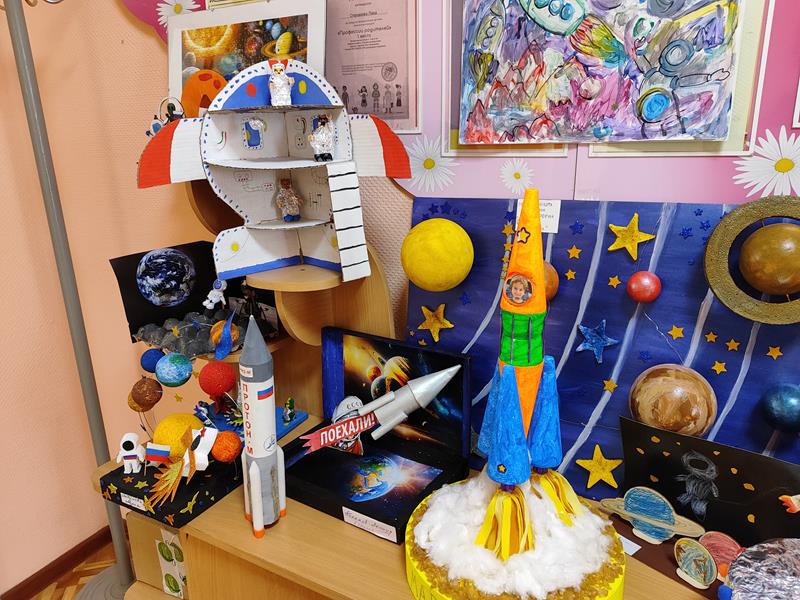 Замечательная выставка совместных работ родителей и детей приуроченная ко Дню космонавтики организована воспитателями в дошкольном отделении на Факельном.
