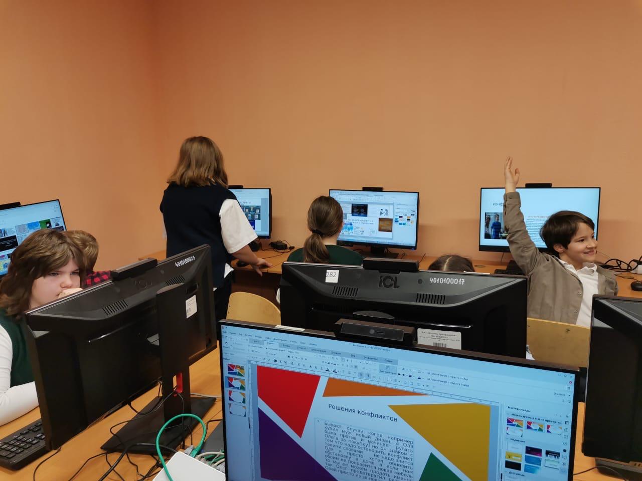 После обсуждения в классе, ученики работали на компьютерах, создавая презентации, в которых делились своими мыслями о том, как можно разрешать конфликты и справляться с возникающими трудностями.